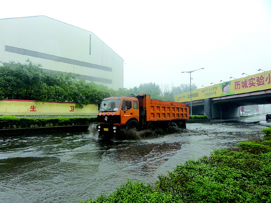汛期的首场降雨造成了济南不少地段再次出现大规模积水的情况。据济南市水文局监测,19日晚7时,昆仑街出现了1.3米高的积水,同时师范路的积水为1.4米。济钢立交桥从18日下午6时出现积水,短时便达到1.2米之深,到20日中午才恢复正常。