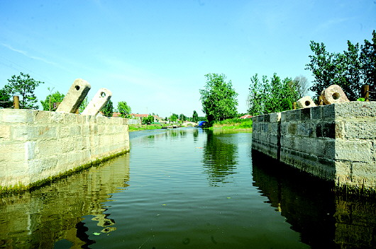现船闸保留有石质闸座,闸座保存基本完整,呈八字形,条石砌成,条石长短不一,厚度多在50厘米左右。南侧雁翅、西侧闸座保存较好。