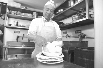 姜德芝是海阳西石兰沟村的,在来烟台打工之前,一直在地里摆弄果树,后来因为儿子在烟台忙不过来,他和妻子来给儿子看孩子、帮忙,现在孩子大了,他就开始打工,主要还是以餐饮业为主。