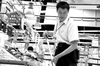 64岁的吴明华是吉林省四平县人,来到烟台有两年了。每天下午两点半,他开始穿着工作服在新世界百货超市打扫卫生。像在烟大餐厅一样,吴明华对待顾客总是笑眯眯的。