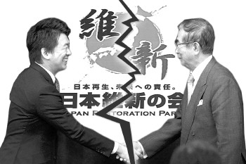 合成图:2012年11月日本维新会成立时,桥下彻(左)与石原慎太郎(右)握手。如今,二人分道扬镳,日本维新会也散了伙。