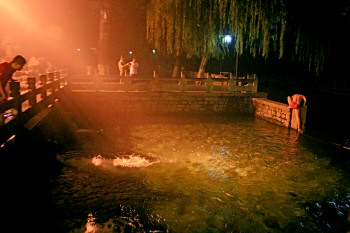 22日零点10分左右,记者来到黑虎泉边。虽然已是深夜,仍有三两游客结伴从黑虎泉边经过、赏泉。这时有两名男子在泉池西南角观望,随后一名男子跳入黑虎泉中游泳,并到兽头出水口处冲凉,其同伴则不时用手机给其拍照。零点20分,另一名男子从泉池东南侧跳入,在泉池中游泳。