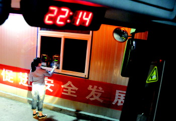 末班车到达终点站,李媛媛正在刷卡。 本报记者 张晓科 摄