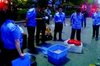 也有一些自称是“送货人员”的违规销售食品摊主,在执法人员的仔细盘问下露出了马脚。一名摊主在执法人员的盘问下,闪烁其词地称自己是送货的,随即逃离了现场,留下很多的货物。