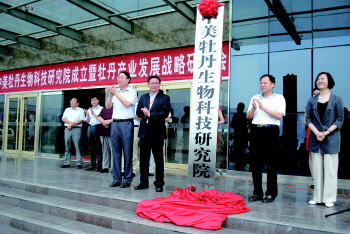 20日9时,中美牡丹生物科技研究院揭牌成立,正式落户菏泽尧舜牡丹产业园。该院由美国皮科医药产品公司(DFI)董事长王天翔和山东洪业集团董事局主席余庆明共同倡导成立,旨在共同研发牡丹产品、成果共享。来自中德化妆品联合研究所、山东大学等单位的十七位专家出席了仪式。