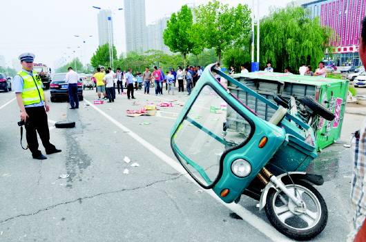 21日10点30分左右,在黄河十二路渤海十五路市工人文化宫附近,一辆尼桑车与一辆装满货物电动三轮车相撞,相撞之后的两辆车受损非常严重,事故没有伤亡,三轮车司机受轻伤。11点50分左右两辆车子被交警拖走。本报记者 郗运红 摄影报道