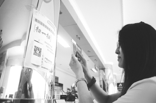 一名纳税人正在扫描贴在大厅的纳税微信服务平台。