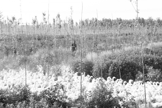 在皂户李镇万亩高标准苗木种植示范基地,赶鹅人正在挥舞长鞭赶鹅。