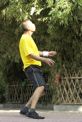 时间:2014年6月7日 自述:晨练时,这师傅娴熟的头顶毽球。 点评:全靠平时积累的功夫。