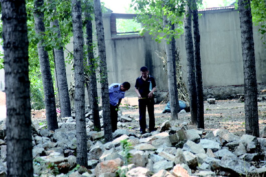 ▲民警在杨树林里勘查。 本报见习记者 苏洪印 摄