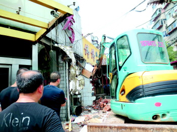 23日上午,在回民小区,市中区泺源街道办事处联合城管、公安等部门,动用大型铲车、运输车及专业拆迁人员,对小区长春观街占道经营的违章建筑进行了拆除。随着挖掘机将违章房屋推倒,原本仅能通过一辆三轮的小胡同,瞬间变得宽敞起来。