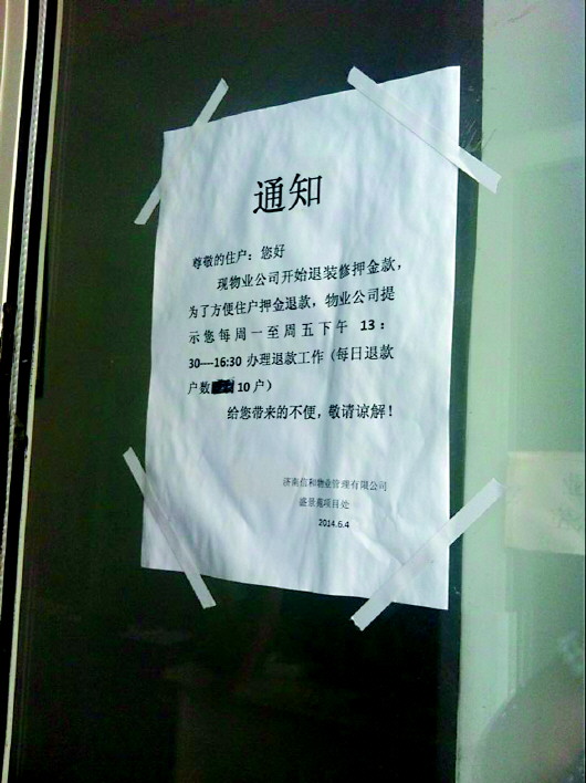 近日,记者来到盛景苑小区物业,看到物业办公室门前贴着一条通知,内容为物业公司开始退装修押金款,每周一至周五下午13:30—16:30办理退款,每日退款户数10户。落款为济南信和物业管理有限公司盛景苑项目处。