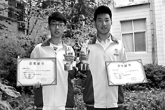 两名“金牌男生”在校园里展示奖状和奖杯。