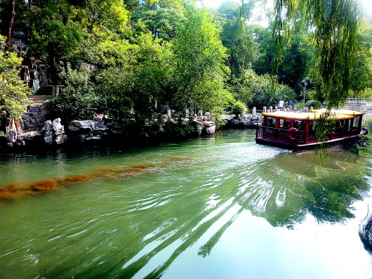 23日,南护城河从五莲泉向西开始变浑浊,到南门桥下已是浑浊不堪。环城景区有关负责人介绍,这是因为近日降雨较多,路面上的污水流入护城河所致。随着黑虎泉泉群中清澈泉水补入,水质会迅速转清。图为每当游船经过,河底泛起污泥,在河水中形成一条黄色的水带。