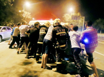 ◥22日晚,众人一起帮忙拽住面包车,消防车向前拉开变形的驾驶室。 本报记者 于飞 摄