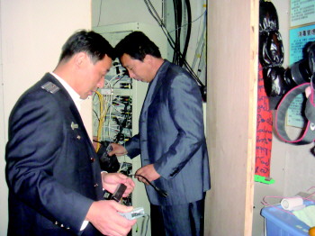 执法人员在现场检查卫星电视地面接收设施。
