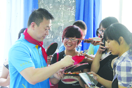 23日,著名乒乓球运动员马琳来到滨城区第一小学,与学生们交流乒乓球技术。学生们拿起手中的球拍,挑战世界冠军,共同享受乒乓球带来的乐趣,热爱乒乓球的师生纷纷与马琳合影并索要签名。