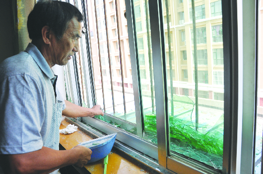 王先生的哥哥正在收拾爆炸后被震碎的玻璃。 本报见习记者 孙秀峰 摄