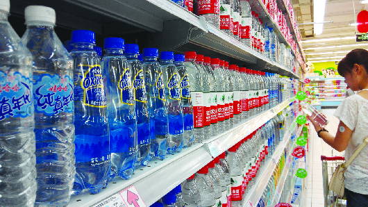 滨州城区一家大型超市的货架上摆满了各式各样的饮用水。