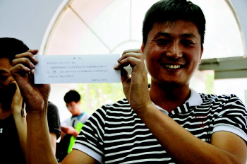 外来务工子女家长在现场填写资料给孩子报名上学。 本报记者 王鸿哲 摄