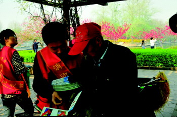 消防志愿者在市人民公园宣传消防知识。(资料片)
