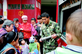 消防官兵为市民讲解消防设施如何使用。(资料片)