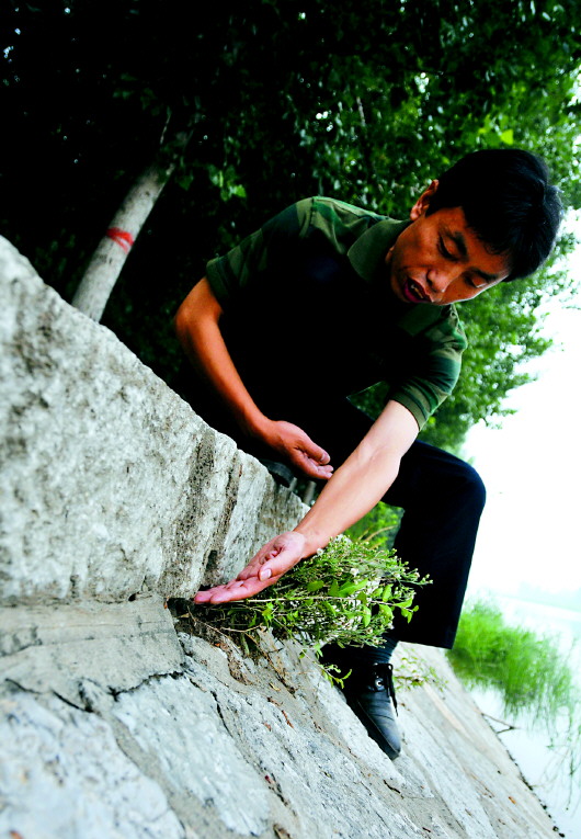 走在石护岸边,李建军两眼仔细地搜索,时不时地蹲下来,用手拔掉障碍物,检查砌缝是否有裂纹。“如果出现了砌缝露出泥土,再经过水流长时间冲刷,土被掏空后,石头没有了支撑,就会出现堤防坍塌,后果非常严重。”李建军说。