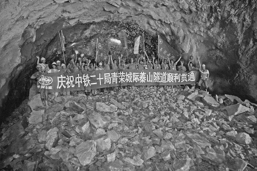 施工人员在隧道内的贯通口庆祝蓁山隧道顺利贯通。