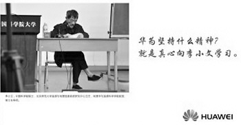 6月5日,华为的这则形象广告在人民日报、环球时报、光明日报、参考消息、中国青年报、21世纪经济报道、人民邮电报等报纸上同时刊登出来。这则广告左边是中科院院士李小文的照片,右边用深红行楷印着两行字:“华为坚持什么精神?就是真心向李小文学习。”