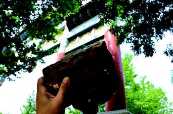 从牌坊上掉下来的水泥块。 本报记者 王倩 摄