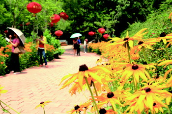 亭台楼阁,水中倒影,群山环绕,云雾缭绕,美不胜收。经历了一场雨水的洗礼,泉城济南平添了几分亮丽,更为济南园林集团红叶谷带来了无限的遐想与久违的清新。婀娜多姿的金光菊几朵偎依在一起,就像一位位将要出嫁的姑娘羞涩的梳理着自己的红妆,而远处的群山,更显得威武挺拔。在这一静一动,一刚一柔之间,便显示出了红叶谷独特的美丽与动人。