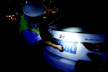 23日晚上8点半,市中交警大队民警在电化路与太白楼西路的交叉口。集中整治过往的车辆。晚上9点45分左右,一辆白色的轿车在距离卡点约100米的位置处突然停下 ,一位驾驶员神色紧张地下车,快步绕到车后,驾驶员匆忙从车牌号上取下点东西。