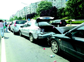 24日上午9时许,在二马路烟台一中向东一百米处发生一起四车连撞事故。第一辆尼桑车突然停车,导致后面三辆车来不及刹车,连续拱上前车,第三辆银白色轿车和第四辆黑色轿车撞得最严重,已无法行驶。好在,现场无人员伤亡。