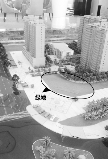 邓先生为记者提供的2012年的售楼处的沙盘图,楼前显示为绿地。