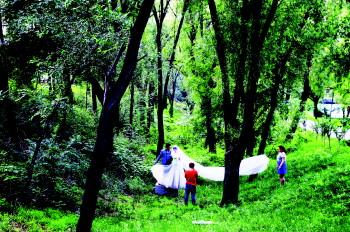 24日,新人在树木葱郁的九龙湾景区拍婚纱照。 本报记者 马志勇 摄