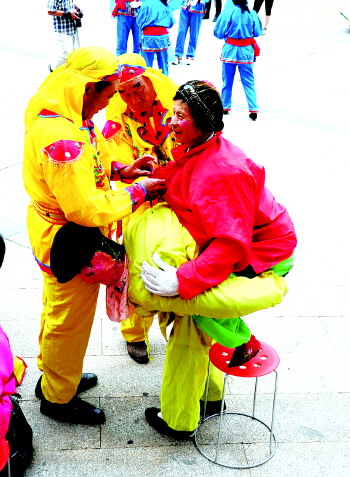 6月14日,气温很高,观众都穿着短袖。而吴忠东钻入“跋跌”道具前,还套上了一件厚外套。“这个道具里面有些磨人,不穿得厚些,硌的肉疼。”上台前,敲锣打鼓的老伙计们帮着两人将道具整好。两个行头分量不轻,“跋跌”道具20多斤,“张老背张婆”道具10多斤。表演过程中,用锣鼓等伴奏,气氛热烈。表演结束,吴忠东从道具里钻了出来时,已是满头大汗。