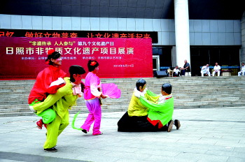 6月14日,日照市非物质文化遗产项目展演上,跋跌第五代传人,67岁的吴忠东表演了“跋跌”。69岁的丁元进表演的“张老背张婆”同时亮相。