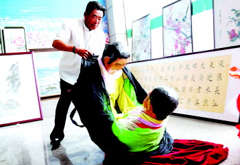 “跋跌”和“张老背张婆”均为一人操纵道具表演,是一人分饰两个角色的单人剧。“跋跌”是用木头制作一个木框架,上边用稻草扎起来做身体,并穿上服装,头部用纸裱糊两个“人头”。框架下部周边用蓝布围住,框架内只有一人操控,使假人面对面对立,并作出摔跤动作,犹如两位真人在台上对决激战。