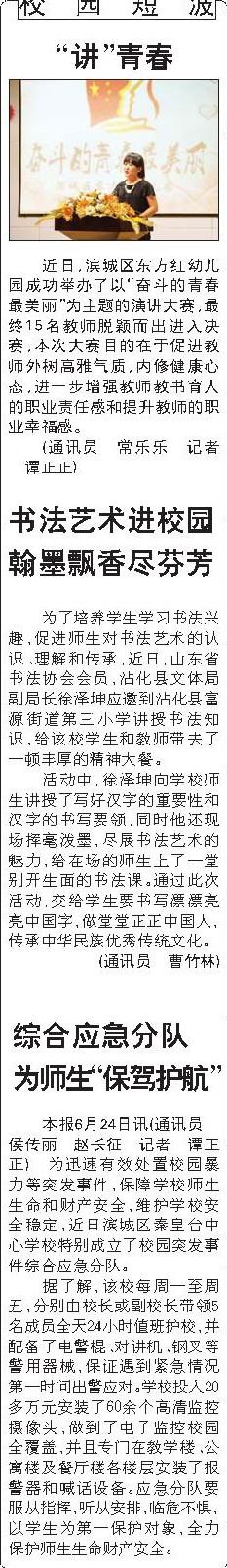 本报6月24日讯(通讯员 侯传丽 赵长征 记者 谭正正) 为迅速有效处置校园暴力等突发事件,保障学校师生生命和财产安全,维护学校安全稳定,近日滨城区秦皇台中心学校特别成立了校园突发事件综合应急分队。