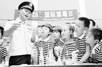 24日,胜利路派出所民警走进辖区君山路小学开展禁毒宣传教育活动。民警通过展示收缴的吸毒工具、发放宣传册等形式,向学生们普及禁毒常识,提高他们认识毒品、鉴别毒品、防范毒品的意识和能力,迎接“6·26”国际禁毒日的到来。 本报通讯员 吉吉吉 贾方勇 本报记者 袁鹏 摄影报道