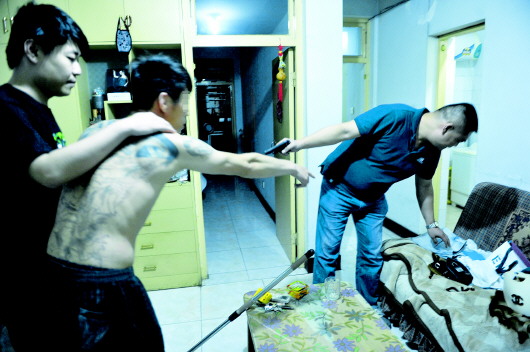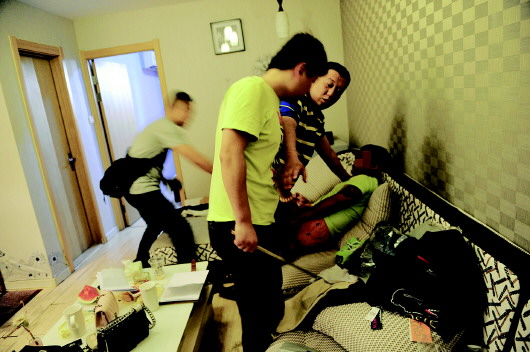 6月10日16点49分,在济南洪家楼附近一小区内,被抓获的两名吸毒者按民警要求跟毒贩联系。