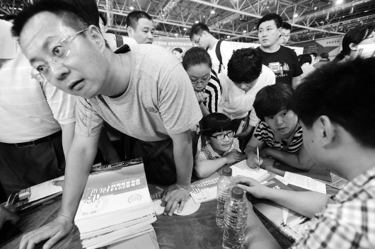 ◤25日,省教育招生考试院咨询台前挤满了前来咨询的考生及家长。