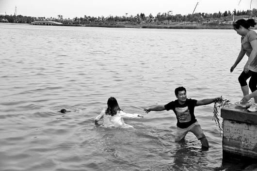 邢思睿跳入湖中,直奔落水者,岸边众人则手拉手准备营救。