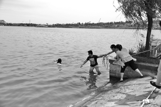 落水者离岸较远,岸边众人够不着邢思睿,这时有人拿来杆子。