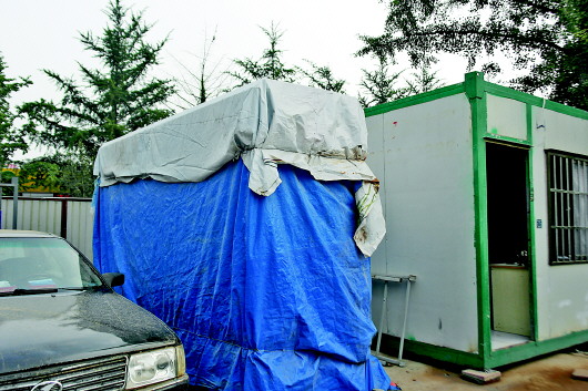 自助书亭的借书设备已经被裹了起来,旁边的集装箱是临时退卡办公室,已有200多名办证读者来退了卡。 王志伟 摄