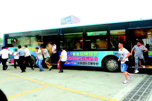公交车上突然有人“纵火”,乘客在司机的帮助下分别从前后门下车“逃生”。25日上午,历城区公安分局联合济南公交公司在全福公交车场开展反恐应急处置预案。 本报记者 杜洪雷 通讯员 王刚 摄影报道