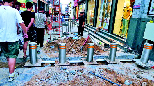 25日,芙蓉街南口新装了电动栏杆,会根据客流情况和运输车辆随时升降,更保证芙蓉街的干净整洁和秩序。