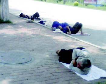 作品描述:城市道路改造的建设者——农民工们,在结束工作后的炎热中午就地午休。