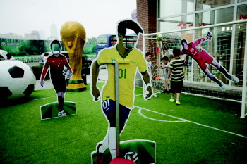 25日,在南京路中联广场,一处袖珍版的世界杯赛场亮相,吸引了不少市民的眼球。据介绍,伴随着巴西世界杯的举行,为烘托气氛,该广场设立了模拟球场,并制作了巨型足球、球门、大力神杯等一系列世界杯道具。