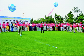 25日,2014第二届世界华人运动大会中国赛区(威海)高尔夫邀请赛举行开球仪式,“多打一杆身体健康,少打一杆幸福愉快,”威海高尔夫球协会秘书长丛培臣代表运动员致辞,希望大家放松心态去享受比赛。人群中传出阵阵笑声。在热烈而和谐的气氛中世界华人运动会主席团主席马俊如先生宣布比赛正式开始。